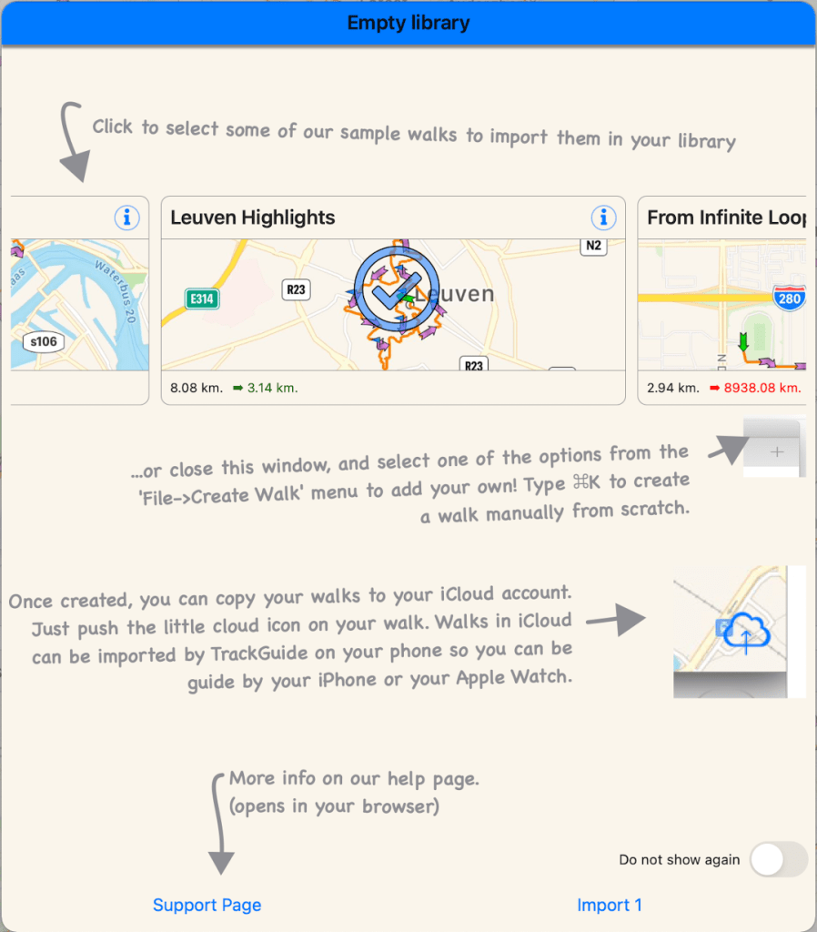 Here you can select some sample walks. The walks through Leuven, Rotterdam and Ostend contain tourist information and photos. If you want to import a few, click on them (the list scrolls horizontally) and click on the ‘Import x’ button (the “enter” key also works. You can close this screen without importing walks via the escape key.). If you click on ‘Support, you will arrive here (Which you found out yourself.)