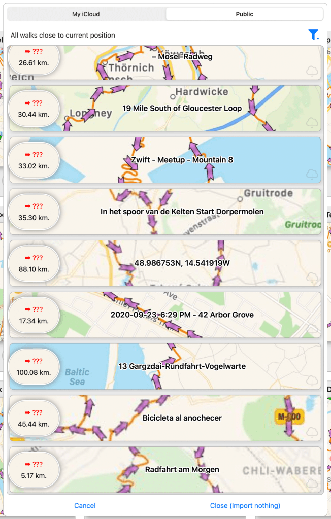 You can set this list to show walks close to a location by clicking the filter button on the top left of the import screen. This opens the filter section of the import sheet :