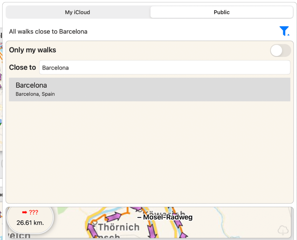 The list of public walks will be refreshed, walks close to the location you selected on top.